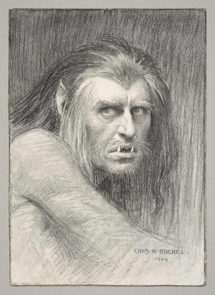 Buchel’s Caliban looks physically imposing with his sharp teeth, long whiskers, and pointed ears. He is clearly not quite human and would even be scary were it not for his eyes and expression. Buchel’s Caliban, though monstrous seeming, looks fearful. His eyes look intense and intelligent. Given his physical appearance, I want to ask what he could possibly be afraid of. Or perhaps, who could he be afraid of? Context tells me that he is likely looking at Prospero. And if that is the case, I begin to question – then who is really the monster?